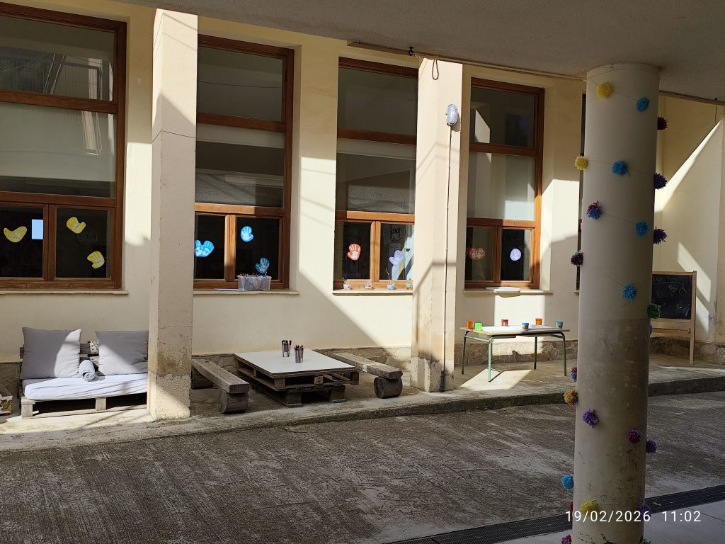 Una de les parets compta amb quatre finestres que inunden l’aula de llum natural, aportant calidesa i serenitat, i ressaltant els colors i detalls de l’espai. Les parets estan enriquides amb portades de contes creades pels propis alumnes, convertint la biblioteca en un lloc viu i únic, on la creativitat dels infants es converteix en part del decorat i de l’experiència de lectura.