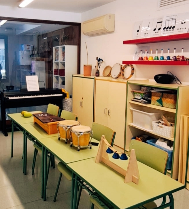 L’aula de música concebuda com un espai educatiu funcional, acollidor i estimulant. La disposició del mobiliari, amb una taula central i cadires adaptades a l’edat de l’alumnat, afavoreix el treball cooperatiu, la participació activa i la interacció entre els infants.