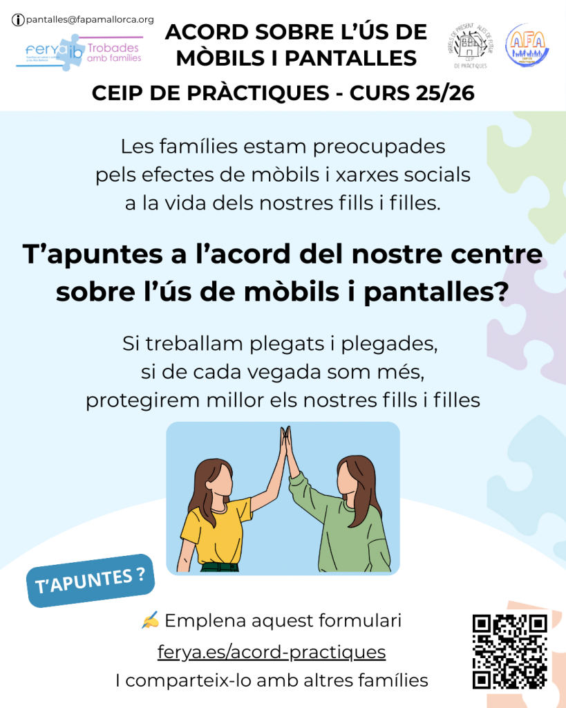 Ens preocupa l’ús creixent i cada vegada més prest de mòbils i pantalles, i les seves conseqüències. A casa moltes ja feim tot el que podem, però aquest acord conjunt ens enfortirà i ens ajudarà en el nostre acompanyament als nostres fills i filles.