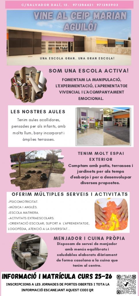 Ja tenim data per les jornades de portes obertes de la nostra escola. Si estau interessats en venir apuntau-vos al següent formulari: https://www.google.com/url?q=https%3A%2F%2Fforms.gle%2FVqBB3T8ZYR9Kca6F9&sa=D