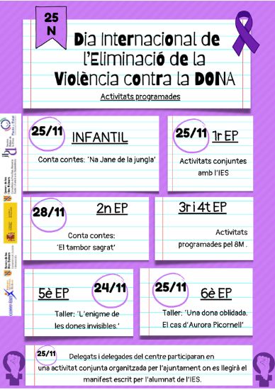 Per a celebrar el “Dia internacional per a l’eliminació de la Violència contra les dones” en el centre hem decorat les nostres Aules. Aquí vos en passam un tast. Trobareu la galeria d’imatges a la columna de l’esquerra.