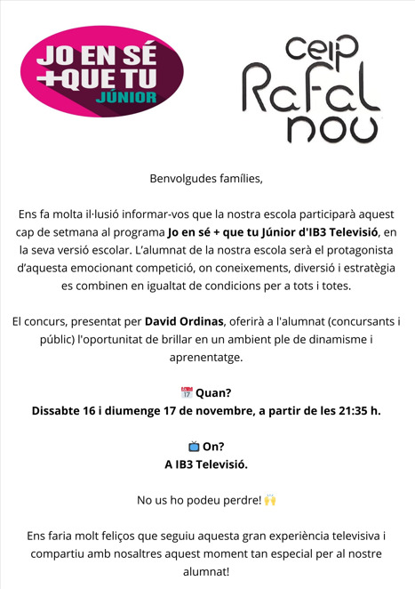 Jaume Llabrés Flexas wrote a new post, EL CEIP RAFAL NOU AL PROGRAMA D'IB3 "JO EN SÉ + QUE TU JÚNIOR", on the site CEIP Rafal Nou fa 1 any, 1 mes