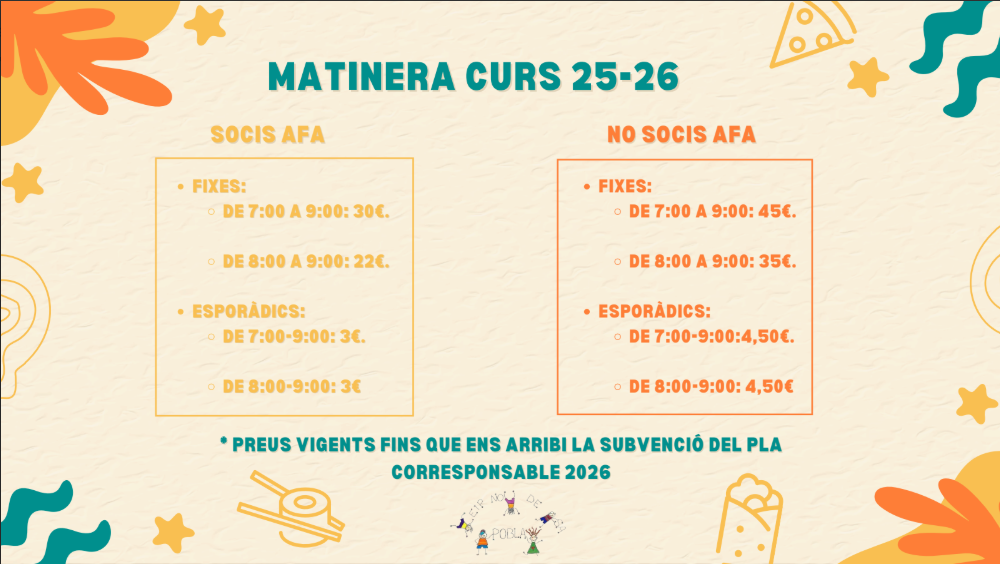 Com ja us vàrem informar el mes de setembre, els preus de matinera eren vigent fins el mes de desembre. El pressupost que hi havia per subvencionar el cost de la matinera l’any 2025, ja s’ha acabat. Per tant, a partir de gener i fins que no arribi la nova subvenció de l’any 2026, els preus seran els que vos adjuntam a continuació, i els que estan publicats als plafons de les entrades del Centre.