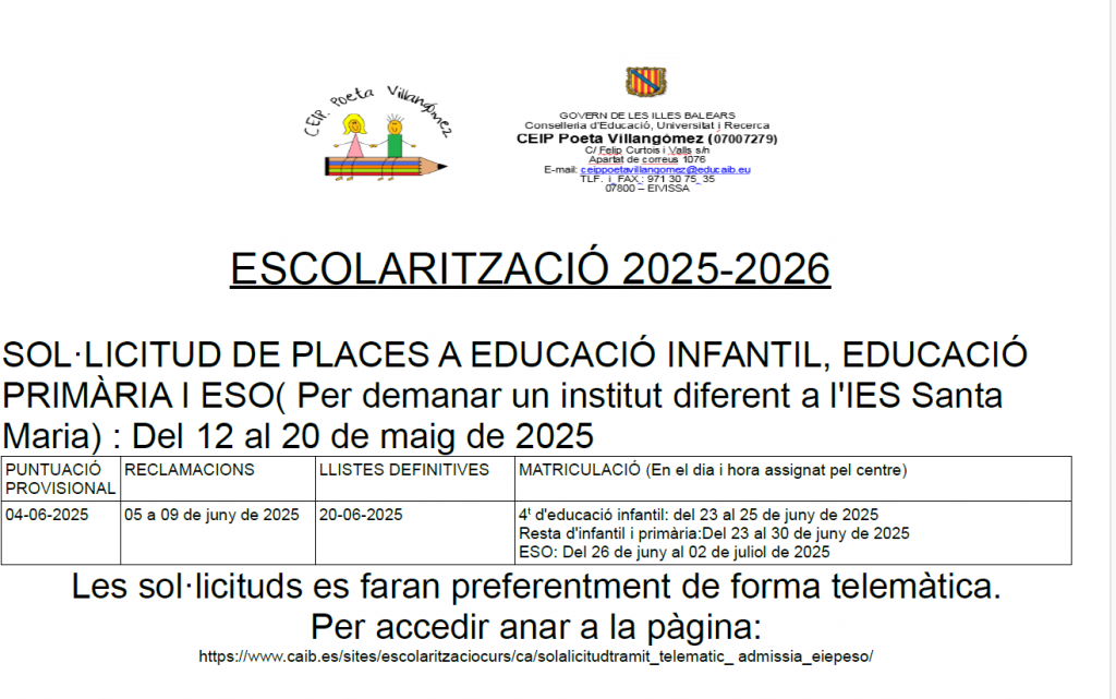 El Ayuntamiento de Eivissa ha hecho la “PROPUESTA DE CONCESIÓN DEFINITIVA DE LAS SOLICITUDES DE SUBVENCIONES EN MATERIA DE ADQUISICIÓN DE LIBROS DE TEXTO Y MATERIAL DIDÁCTICO PARA EL EJERCICIO 2025” que ha sido de 4.600€ en concepto de 92 alumnos/as escolarizados/as en el centro.